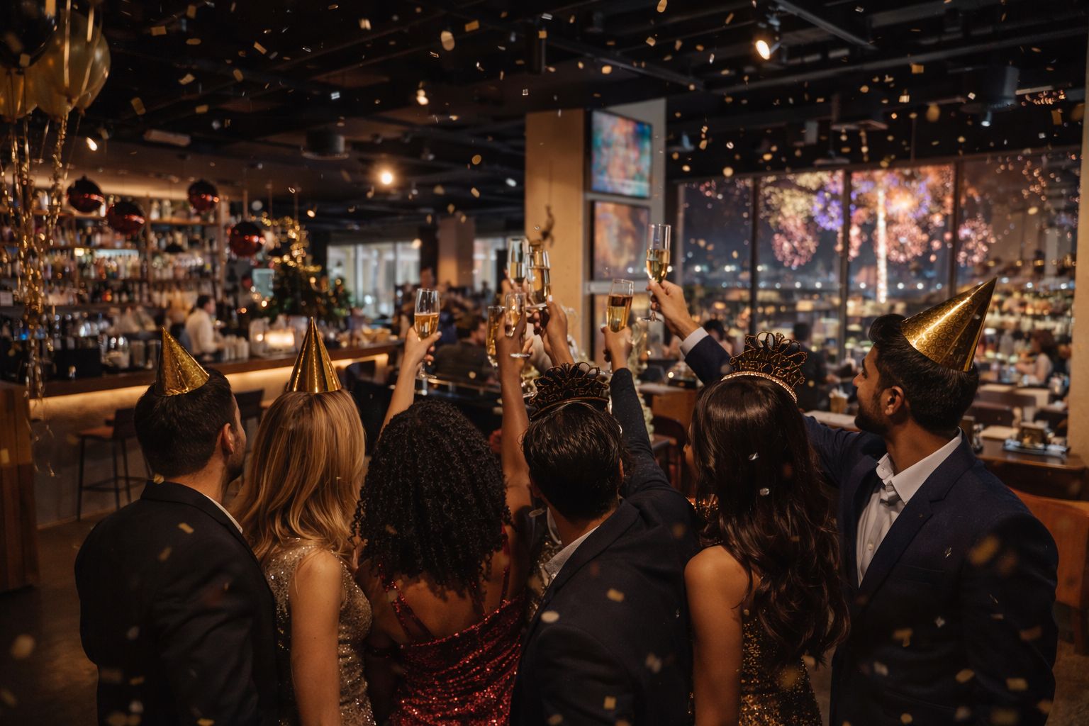 A full, vibrant atmosphere: music, movement, and New Year’s energy done right.